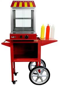 Hot-Dog-Dampfgarer mit passendem Wagen Kapazität: 100 Würstchen & 30 Brötchen Temperaturregler, Temperaturbereich 30 - 110 Grad 30 Minuten bis 100 Grad erreicht ist Anschlusswert: 230 V / 2 kW Steamer : Breite: 40.5 cm / Tiefe: 32.5 cm / Höhe: 69 cm Wagen: Breite: 95 cm / Tiefe: 41 cm / Höhe: 81 cm Gewicht: 13.8 kg